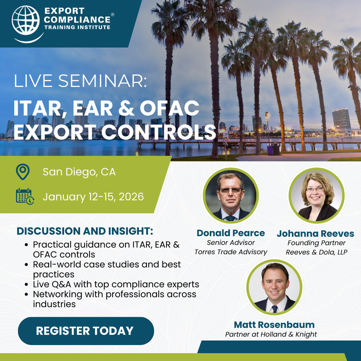 Export Compliance Training Institute (ECTI) Presents: ITAR, EAR and OFAC Export Controls Seminar in San Diego, CA – January 12-15, 2026 January 8, 2026 by kmunch@strategicseven.com Comments are off This post is user submitted content and not an official ICPA event or endorsement. Contact the event sponsor, not ICPA, for any questions about specific announcements. View ITAR Controls AgendaView EAR & OFAC Controls Agenda 25% off during our Winter Sale with code WINTER25 Learn more and register Posted in:Seminars